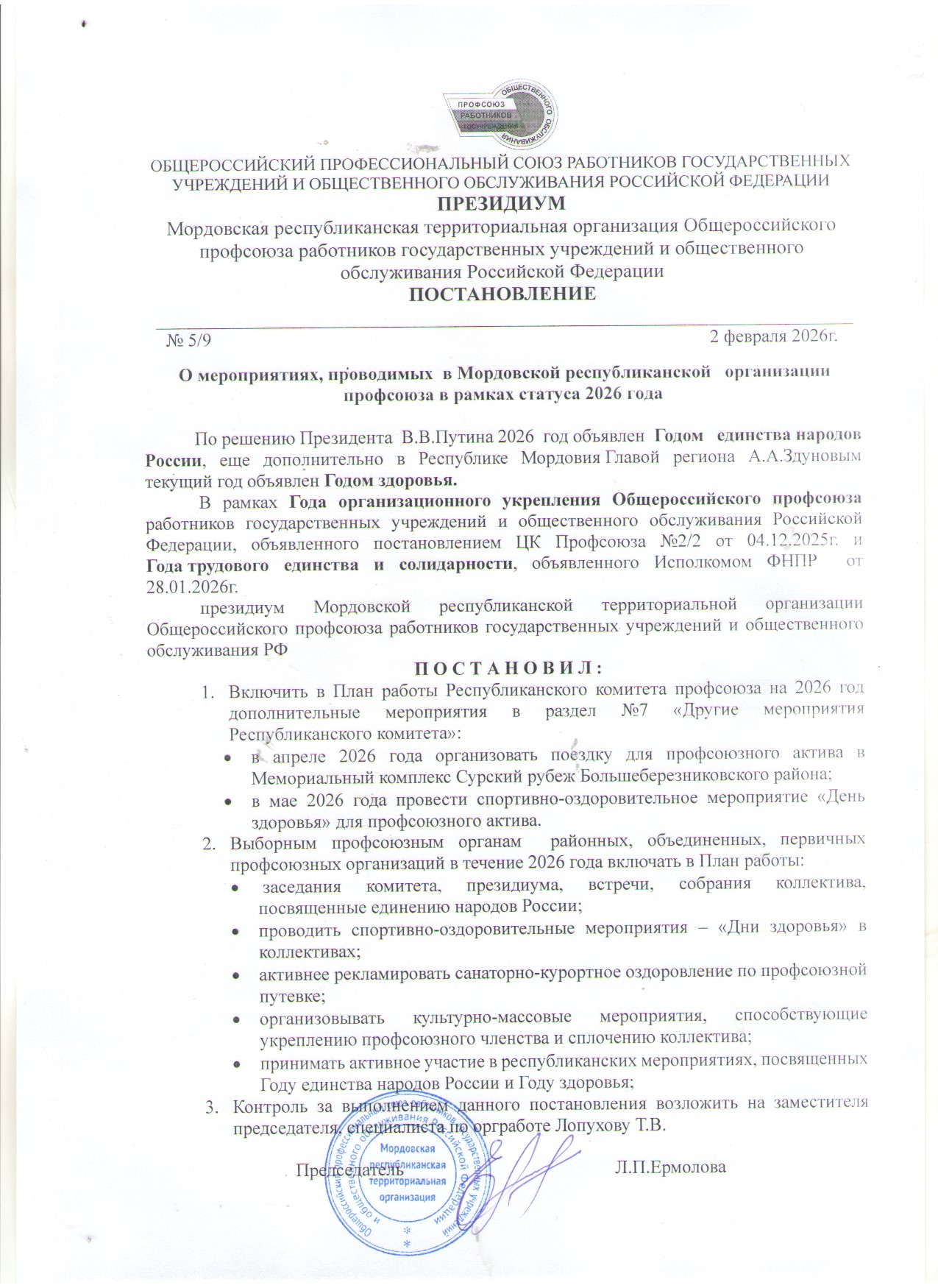 Постановление о мероприятиях в Мордовской республиканской организации профсоюза в рамках статуса 2026 года 3 февраля 2026